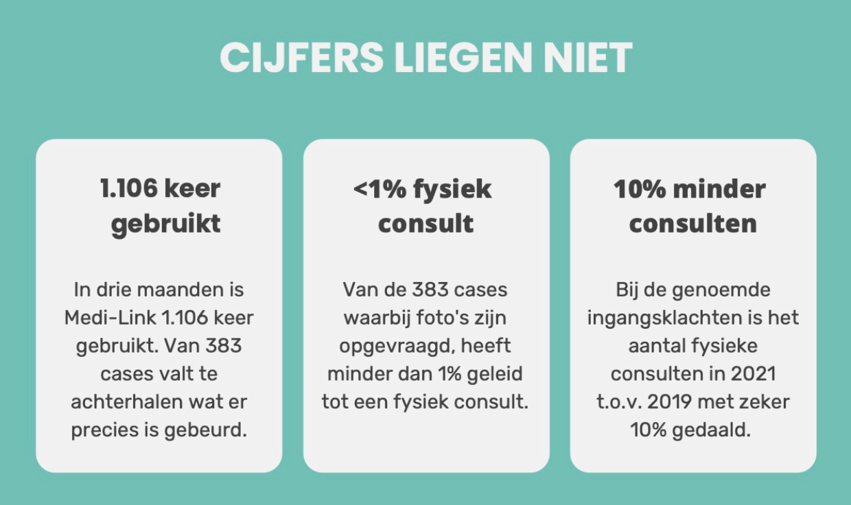 Medi-Link is een beveiligde applicatie voor het verzenden en ontvangen van foto's van patiënten, veel gebruikt bij ingangsklachten als huiduitslag en insecten- of kwallenbeten. De klacht kan door de huisarts op afstand worden beoordeeld. Het maakt niet uit waar de patiënt zich bevindt, Medi-Link werkt plaats onafhankelijk.
